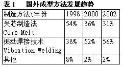 汽车动力系统用进气歧管,历来是用金属制造的。由於歧管的形状复杂,以前是用铝含金铸造的,但内壁粗糙,使用时对空气的阻力很大,噪声大,致使燃烧不充分,废气排放多。在上个世纪80年代开始,欧洲开始用失芯制造法(Core Melt),如此制成的歧管不仅成本高,而且有一定废品率,因为歧管的材料PA66(或PA6)经玻纤增强後,其加工温度在250至260℃,虽然在模内与型芯的接触时间仅几分钟,但部分型芯也不可避免地被熔解,使歧管的内壁尺寸难以被控制。近年来由於振动焊接技术的发展,对於大尺寸的玻纤增强PA66的焊接技术日趋成熟,为此歧管可用注塑成型为二片歧管零件,经振动焊接而成为一体。目前世界上多数汽车制造商使用此法生产歧管,使金属制歧管塑料化(见表1)。