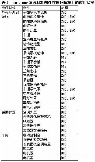 英国的瑞利安公司、法国的Renault公司先後采用SMC制造车身及附件。美国GM公司在Camaro车和Fiebird车上使用了SMC车顶、後门和侧门。Ford公司在Mustang车上应用了SMC发动机罩,并将在Lincoln continental车上应用了SMC盖板、发动机罩和前防护板。这些例子仅仅作为推广应用的前奏。