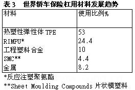 目前在世界范围内约有92%的保险杠是用高分子材料制成的(表3)。因为用塑料制造保险杠可以根据美学和实用两方面来塑造时尚美观且不失功能化的造型。而且从强度上考虑,金属在受到轻的碰撞後,会在金属面上留下痕迹,而用塑料制造的保险杠对类似的危害有更好的防御性。现在的塑料保险杠是由三层组成:面板材料是用PP、PE/ABS、PC/PBT;骨架材料可以是木材、金属;中间是以PP发泡材料或PU发泡材料。就目前的发展来看,此类材料不利於回收利用和不符合环境友好原则。近年来国外有人提出用TPE来制造汽车保险杠面板,而用玻纤增强PP制造骨架,再用发泡PP制作中间的缓冲层,都是同一族的材料,有利於回收循环使用。在回收循环使用前,只要清洁和乾燥处理,就可以按一定比例重新制造保险杠。