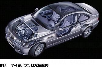 通过Landshut厂CFP塑料专家、宝马研究革新中心专家和宝马公司汽车工程师的密切合作而开发和设计,宝马BMW M3 CSL型汽车的车顶充分体现了采用轻质CFP增强车体结构的优势。为了保证部件所需的稳定性之外,考虑材料的光洁度和外观,还采用了最佳的生产流程,以利用透明层漆面展现CFP材料的组织结构。BMW M3 CSL型汽车车顶在Landshut厂分三个生产阶段制成。第一阶段中,将5层专用碳纤维层叠放置进行预成型。这一阶段的重要要求,同时也是这一过程的一项重大革新,是确保碳纤维妥善排列,准确到位,具备合理的结构,提供车顶所需的稳定性和外观。第二阶段是树脂压铸(RTM)注射工艺,将已预成型的多层碳纤维垫放入1,800吨压机,将透明型环氧树脂注射到材料之中。然后,车顶在高温模具中硬化,最后,由机械手从模具中拆除,漆上透明漆。