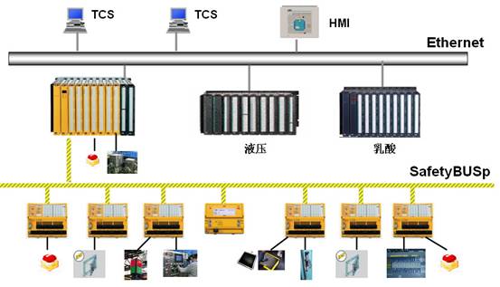 | 所有的安全输入输出点多达700个,并且分布分散在地下油库、乳酸区、轧机工作区、主控操作区域等。显然,采用集中式的控制系统显然是不合适的。所以,在该条生产线中,使用了pilz的SafetyBUS p 安全总线系统,进行离散的控制。 |
