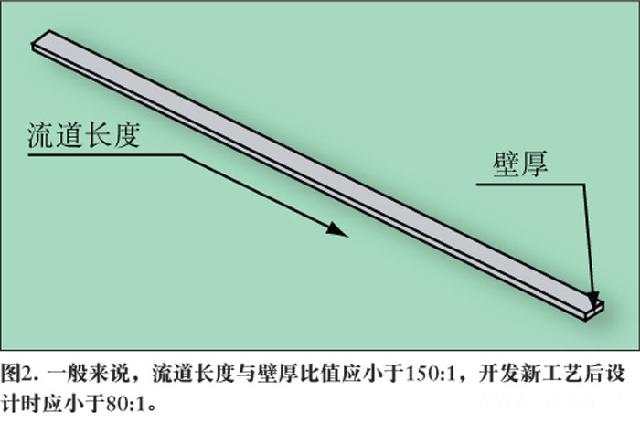 基材与覆盖材料之间的止逆装置对于粘合效果极为关键,应避免让射出的覆盖材料逐渐变薄或起毛边。覆盖材料太薄,会导致粘合不牢、脱胶与卷边。良好的止逆装置设计应将覆盖材料与基材明显隔开。图1中基材凹处即利用了这种设计。 射嘴孔设计对于二次注塑的成功同样重要。流道长度与壁厚比值是影响粘合效果的主要因素。根据经验,该比值不应超过150:1,开发新工艺设计时比值应保持在80:1左右。图2显示了流道长度与壁厚的比例关系。 为了尽量缩短流程,射嘴孔应设置在壁厚最大的位置。使用TPE树脂时,要注意射嘴孔径大小。TPU等材料需要大口径射嘴,以适应较高的粘度,防止剪切力过高而发生材料降解。SEBS等材料需要较高的剪切速度以获得最佳的流速。较好的办法是在最初阶段使用小口径射嘴,初次采样后再调整射嘴大小。 与射嘴孔一样,出风口也是影响粘合效果的重要因素,如何控制空气余量是一大难题,如果控制不好,就可能出现粘合不牢、充填毛边的现象。出风口的深度对于防止毛边极为关键,根据覆盖材料粘度的不同,出风口的深度应该在0.0005-0.001英寸之间。
