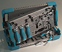 图4是做二次注塑之前的基材手柄特写图片。根据设计,这些手柄需要进行二次注塑,才能成为最终产品。依据覆盖材料形状和厚度的不同,可以采用单层或双层二次注塑。 图5是用于不同手术作业的二次注塑手柄实例。依据参数规定,这些手柄可统一放入一个工具盒。 图6为放置各种手术器械的工具盒。它由金属板经过激光切割、弯曲、移印加工而成。其边缘有TPE缓冲垫,使各个转角更为圆滑,起到保护作用,同时还能减震,以达到坠落-冲击测试的要求。工具盒二次注塑使用的是硬塑手柄材料,可承受多次272?F蒸汽灭菌以及使用氢氧化钠等腐蚀性化学品稀释溶液的冷化学灭菌。