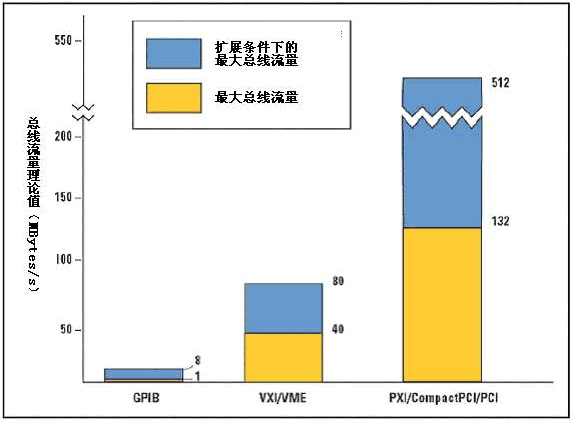 一个决定系统流量的关键因素是测量设备与计算机之间的接口总线。尽管系统性能由于处理器速度与系统内存的增加而大幅提升,却依然受到与仪器与外部设备的通信因素限制。GPIB是最常见的仪器接口总线,但其数据传输速率比VXI和PCI慢得多。基于VXI的测量系统具有高于GPIB的性能,但用户必须为之付出高昂的代价。相比之下,PCI是为新型处理器设计的,数据传输速率比GPIB和VXI高得多。