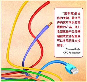 OPC Foundation的主席Thomas Burke先生指出,推动各网络标准的协作和互用性一直是他们的目标。OPC参与了有关电子设备描述语言(EDDL)标准的推广工作,利用EDDL技术我们能让最终用户对设备生产商所生产的超过1500万种设备和仪表进行诊断、配置,并从中获取实时的资产管理信息。OPC还积极推动和协助开发OPC统一体系架构(OPC-UA)标准。