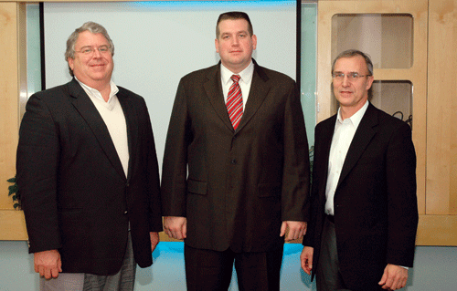 GE Fanuc自动化全球副总裁Stuart W. Scott先生(左)和Christopher 先生(右),以及GE Fanuc自动化大中国区销售及渠道运作总监石泰武先生(中)