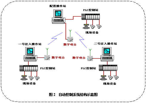 计算机监控系统的控制方案是使用工业控制计算机加可编程控制器组成的自动控制系统代替原手动控制系统,配置站和注入站完全实现自动控制,通过数字电台进行数据通讯,达到配置站和两个注入站之间的联动控制,各站的控制系统组成一个有机的整体系统,改变过去自成体系的分裂局面。这样不但可以降低工人的劳动强度,提高工作效率,而且可以很好地协调聚合物配置与注入之间量的关系,有效地降低成本,达到最佳配置效果。自动监控系统的结构如图2所示。