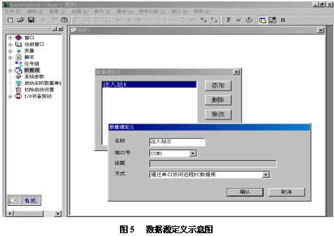 在两台注入站计算机上运行图形界面组态程序DRAW,在导航器窗口中单击“数据源对话框,弹出数据源定义对话框,单击“添加”在弹出的对话框的方式栏中选定“通过串口访问远程PC数据库”,然后选择串口和定义数据源名称,不妨将数据源定义为“注入站1”和“注入站2”如图5所示。在组态数据画面时,引用的数据要正确选择相应的数据源,注入站与配置站之间就可以互相交换数据了。