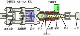 注塑机械具有能一次成型外型复杂、尺寸精确或带有金属嵌件的质地密致的塑料制品,被广泛应用于国防、机电、汽车、交通运输、建材、包装、农业、文教卫生及人们日常生活各个领域。注塑机械的工作原理与打针用的注射器相似,它是借助螺杆(或柱塞)的推力,将已塑化好的熔融状态(即粘流态)的塑料注射入闭合好的模腔内,经固化定型后取得制品的工艺过程。注射成型是一个循环的过程,每一周期主要包括:定量加料—熔融塑化—施压注射—充模冷却—启模取件。取出塑件后又再闭模,进行下一个循环。一般注塑机包括注射装置、合模装置、液压系统和电气控制系统等部分。