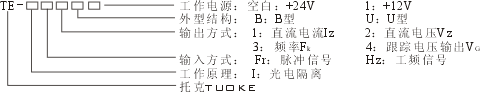 注意:定货型号应包括:传感器型号、输入/输出规格(输入/输出范围值)、精度等级等。例如:TE- IFr2B-0.05KHz/1~5V-0.5。