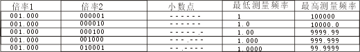 - 本产品采样周期为1秒,最低测量频率为1次/秒,最高测量频率为10000次/秒,当需要显示小数点后面的位数时,最高测量频率将受到六位数码显示的限制。作为频率测量时,倍率1、倍率2、小数点位重设定三个参数,应满足下列公式: