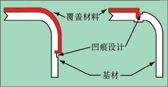 基材与覆盖材料之间的止逆装置对于粘合效果极为关键,应避免让射出的覆盖材料逐渐变薄或起毛边。覆盖材料太薄,会导致粘合不牢、脱胶与卷边。良好的止逆装置设计应将覆盖材料与基材明显隔开。图1中基材凹处即利用了这种设计。