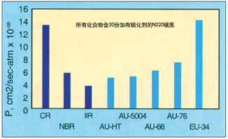 混炼型聚氨酯中,EU-34的渗透性较大,接近CR。由于几种汽车的使用中对氮气环境的渗透性能要求较高,因此正在开发改进型的聚氨酯橡胶。