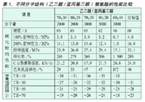 | 表1、不同分子结构(乙二醇/亚丙基二醇) 聚氨酯的性能比较 |