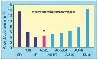 新开发的混炼型聚氨酯AU-28渗透性能超过以前性能最好的混炼型聚氨酯,并且渗透性能更接近丁基橡胶(图2)。