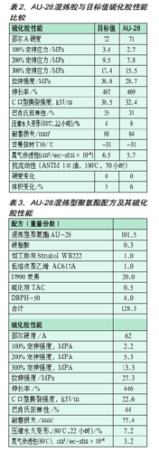 | 表2、AU-28混炼胶与目 标值硫化胶性能比较 |