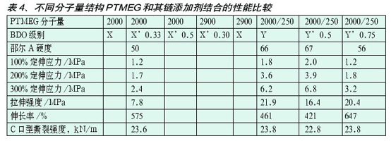 | 表4、不同分子量结构PTMEG和其链添加剂结合的性能比较 |