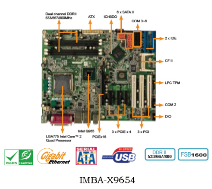2007年初,IEI芯发威达很荣幸的宣布通过RoHS认证的micro ATX工业级母板的IMBA-X9654上市。IMBA-X9654采用了高效能的Intel® Q965+ICH8DO芯片组,可支持LGA 775 Intel® Core 2 Quad/Duo, Pentium® D/4 , Celeron® D 处理器, 533/800/1066MHz前端总线,可支持高达4GB的DDR2 533/667/800MHz的双通道系统内存。由于采用PCI-express技术,IMBA-X9654可满足现代工业应用对高带宽的需求。IMBA-X9654内置高性能的Intel图形芯片(Intel Q965),并且板载1 x PCIE x16槽、3 x PCIE x 4槽,并且带6个支持Raid 0、1、5 、10的SATAII接口,还支持多达10个USB2.0。IMBA-X9654同样满足工业平台对产品支持周期长的特性要求。