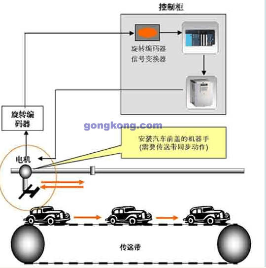 1.概要 在汽车生产线上,需要保持机器手与传送带同步动作 -适用领域:汽车生产线 -产品种类:SV-iS5 2.主要功能 -较短的加减速时间(ACC→0.5S, DEC→2.0S) -从旋转编码器上接收的反馈信号存在时间延迟问题,会对机器手启动时间有影响(需要把电流输入滤波时间常数从10ms改为0ms) 3.特殊事项 -线速度不快 4.参数设定 标示 功能名称 工厂出厂值 设定值 ACC 加速时间 10.0(sec) 0.5(sec) DEC 减速时间 20.0(sec) 2.0(sec) I/O-6 I输入滤波时间常数 10(msec) 0(msec)