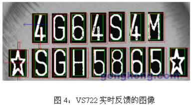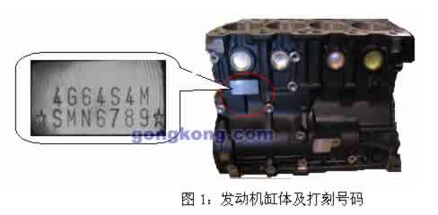 进入工位的缸体携带M/P存储卡,卡中存有缸体号码信息,PLC通过串口利用RFID读写器从存储卡中读取号码信息,并在触摸屏TP170B上显示出来。PLC通过读取的号码信息判断是需要启动左边或者右边的传感器进行拍照,图4显示了拍照的实物图像,VS722完成拍照后马上进行字符识别。