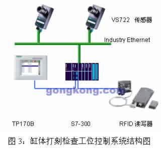 4 系统工作原理 4.1 VS722与PLC之间的数据通讯 视觉传感器VS722与PLC之间的数据传递可以通过三种方式: VS722提供了8DI/DO的硬件接口,可以与PLC硬件连接实现拍照触发指令,结果返回等简单的数据传递。 通过PROFIBUS 或以太网实现VS722与PLC之间简单通讯,这种通讯方式使用标准通讯功能块FC72,通过VS LINK 用PROFIBUS总线方式 能实现28K字节的通讯,通过以太网可以实现60K字节的通讯。在这次应用中VS722和PLC之间的通讯就是通过这种方式实现的。 如果数据通讯要求更高可以选择增强型通讯,通过PROFIBUS 可以用背景脚本映射虚拟I/O的方式来实现;如果要用以太网来实现增强型数据通讯,可以选用两种驱动模式:系统/数据连接驱动和背景脚本触发。 总之,VS722提供的通讯方式非常灵活方便,在实际应用中要根据数据通讯量、实时反馈速度要求、项目成本等实际情况来选用合适的通讯方式。 4.2 缸体打刻号码的识别 如图2所示,缸体打刻检查控制系统由主控PLC、VS722、ELS、TP170B以及RFID读写识别系统构成。VS722与PLC的信息传递通过以太网实现。