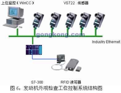 为实现号码的识别,需要在SPECTATION软件中进行编程,创建一个PRODUCT下载至VS722中,在PRODUCT 里定义了16个OCR软传感器。 4.3 发动机零部件错装漏装的实现 发动机外观检查工位由主控PLC (CPU313-PtP),VS722,ELS以及用户指定的OMRON的RFID读写系统构成。VS722与PLC的信息传递通过以太网实现。监控计算机的上位软件采用WINCC。