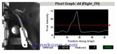 发动机工件进入工位,定位抬起上升到位后开始拍照,每个传感器对比检查不同的部件,如果发现有工件与标准图像不同将发出报警,同时WINCC画面上将不合格项对应的图片自动弹出。由于已将VS722拍摄的图像显示画面集成在WINCC软件中,如果出现不合格项将自动捕捉实时画面,由操作人员根据画面或实物进行最终检查确认。 对于发动机零部件错装漏装的检查,SPECTATION提供了下列软传感器,特征值(Feature Count)、边沿计数(Edge Count)目标发现(Object Find)、模板匹配(Template Match),计算工具(Math Tools)。针对不同的检查部位,根据不同 的图像特征选择合适的软传感器进行检测。下图显示的是用特征值计数传感器检测氧传感器线束颜色的像素示意图。