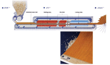 最近两次会议中介绍了一种新型加工方法,无需挤出用木质复合材料生产平板。Pallmann Maschinenfabrik公司(美国Pallmann Pulverizers的德国母公司)与德国的Schilling-Knobel公司共同努力,开发了双带式木质复合材料加工方法,并在法国的CTBA会议上展示。在这种加工方法中,Pallmann的Palltruder机第一步先用木粉或纤维、加上原生或再生HDPE造粒。然后这些被称作Pallwood的粒料分散到Schilling-Knobel公司提供的PFIX加热双带成型机(以前常用于制造PVC地板)下面一个皮带上。Schilling-Knobel公司也在为一家大型美国层压公司和世界其他客户开发其他木质复合材料产品。它的双带成型生产线经过测试,可以将60%木材粒料加工为2米宽、8至10毫米厚的片材。