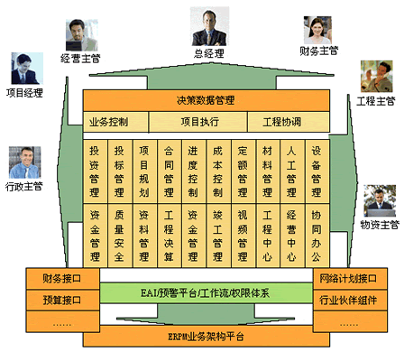 ERPM软件以成本控制为核心,以和为主线,实现、、、、、、、、、、、等业务管理,以及人力资源、财务、等资源管理,并扩充到、、电子商务等功能;通过“关键控制点”与“工程主协调单元”对流程任务的各项指标进行监控,通过决策与执行的一体化,打造企业有效的反馈体系,实现职能型向流程型的管理转变;率先在国内开创工程项目管理软件的成功应用模式:决策+控制+协调+执行=工程业绩。 |