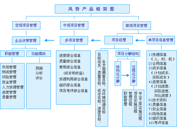 - 中观项目管理:主要负责多项目信息的采集、处理、控制、协调以及动态监测与评价;。以公司各部门和项目的职能为出发点,满足公司各个部门和项目各自管理目标的要求。