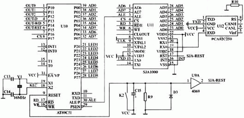 图2 CAN总线控制器、总线驱动器和单片机连接图 |