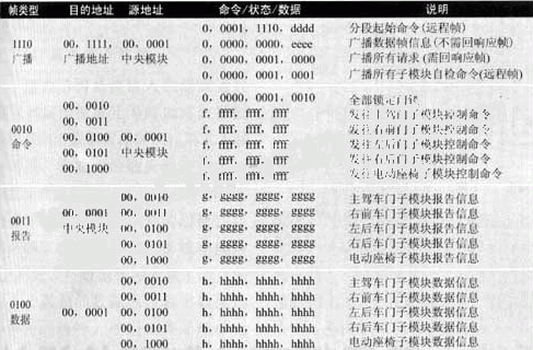 本协议遵循CAN2.0B规范,根据车身控制模块的特点,采用源→目的方法,每个节点都有自己固定的标识地址,且节点数小于64,设计时可将中央控制模块设为主节点,而将车门、电动座椅子模块及自检子模块设置为从节点。本协议可完成以下功能: