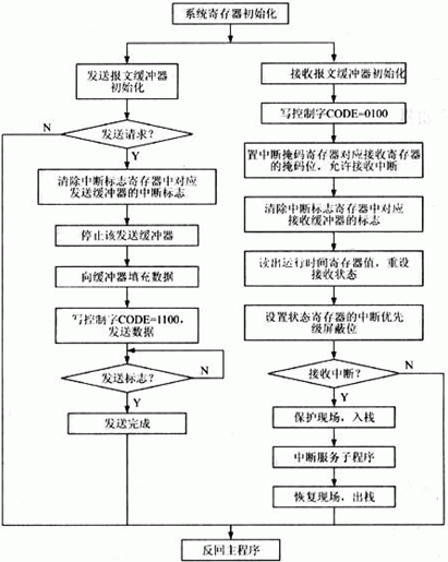 各控制器应按规定格式和周期发送数据到总线上,同时也要接受其他控制器的信息。总线上的其他控制器则根据需要各取所需的报文。对于接收数据,本系统采用中断方式实现。一旦中断发生,即将接收的数据自动装载到相应的报文寄存器中,此时还可采用屏蔽滤波方式,利用屏蔽滤波寄存器对接收报文的标识符和预先在接收缓冲器初始化时设定的标识符进行有选择地逐位比较,只有标识符匹配的报文才能进入接收缓冲器,那些不符合要求的报文则将被屏蔽于接收缓冲器之外,从而减轻CPU处理报文的负担。此外,不同数据应放入不同的报文寄存器中,因此在接收中断服务程序中,就可以容易地判断出中断是由哪个接收报文引起的,其程序流程图如图3所示。