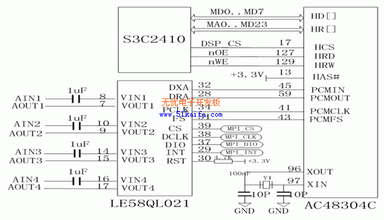语音CODEC采用AMD的LE58QL021,该器件是3.3V单电压用户线语音处理器,在小型语音网关中是AC48304的常用搭配,支持4通道语音AD/DA,支持E1 PCM Highway,能与AC48304实现无缝连接。LE58QL021的工作模式可软件编程控制,ARM通过MPI(Microprocessor Interface)串行控制总线设置LE58QL021的各种工作参数。