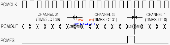 AC48304是AudioCodes公司基于DSP设计的一个四通道语音处理器,支持多种标准、多种码率的G系列语音编码器,如G.723.1,G.711,G.726和G.729等,支持T.38传真中继和其他语音信号处理功能。在系统中,ARM通过CPU局部总线实现对AC48304的控制及数据交换。AC48304与LE58QL021之间通过E1 PCM Highway接口实现多通道数字语音接口。E1接口由2.048Mhz时钟驱动,有0~31共32个8位时隙,工作时序如图2所示。