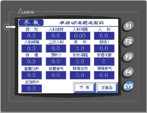 预吹、入料延时、入料间隙、入料、入料间隔、二次入料、返料、预热1、锁模、预热2、穿透次数、固模加热、移模排气、移模加热、固模排气、加热间隔、主加热A/ B、保温、排气、固模/移模水冷、固模排水开/固模排水关、移模排水开/移模排水关、模内压、预开模、固模吹气/移模吹气、二次脱模、二次压模、开模超时。这28项参数的设定将很大程度上影响产品的质量,用户可以根据不同的产品调整每个工段所需时间的长短,丰富的界面使工艺参数的设定非常方便。