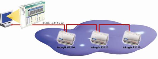 ioLogik R2000 系列中的 RS-485 I/O 服务器除了传统应用外也能用于 I/O 服务器的扩展。 在传统应用中,一台电脑可以通过两线 RS-485 连接 32 个 RS-485 I/O 服务器,最大传输距离 1.2 公里。 ioLogik R2000 I/O 系列兼容 MXIO 函数库,这样可简化系统集成商开发 IO 监控程序的过程。此外, ioLogik R2000 系列服务器也支持标准的 Modbus/RTU 协议,保证了与其他 SCADA 软件的兼容性。