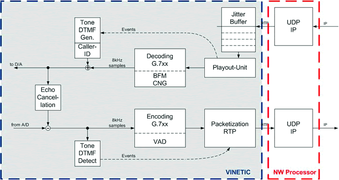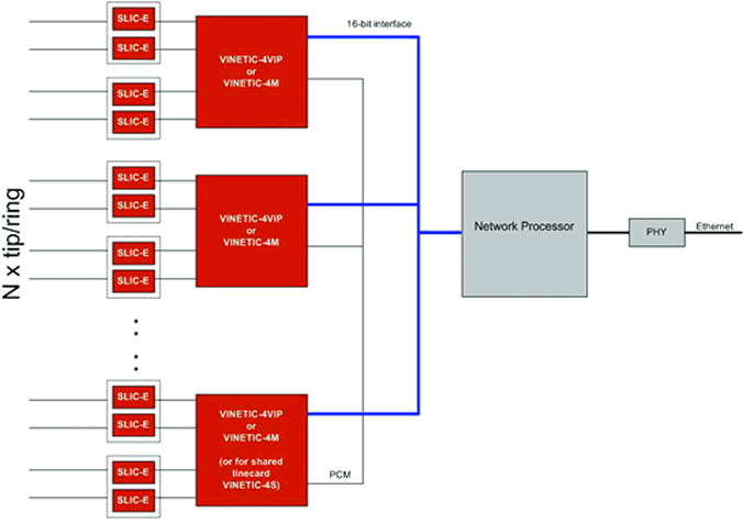 英飞凌科技公司的VINETIC语音处理器家族包括多个可灵活伸缩的设备,这些设备在引脚和软件方面互相兼容,可提供2模拟端口和4模拟端口版本。对于VoIP而言,VINETIC-VIP和VINETIC-M是专用设备,可将组包功能集成到设备里。VIP版本具有全面功能:G.729A/B/E、G.728、G.723.1、G.726和G.711压缩和T.38传真中继数据泵。M版本体积略小,通过利用 G.711或G.726允许语音占用更多带宽,从而实现更低价格。