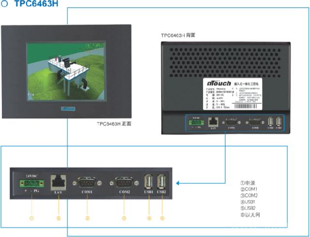TPC6463H,是一套以嵌入式低功耗CPU为核心(主频400MHz)的高性能嵌入式一体化工控机。该产品设计采用了6.4英寸高亮度TFT液晶显示屏(分辨率640×480),四线电阻式触摸屏(分辨率1024×1024),同时还预装了微软嵌入式实时多任务操作系统(中文版)和MCGS嵌入式组态软件(运行版)。