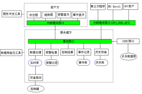 为了效率,服务器上的实时数据和历史数据一般都以私有格式存放,实时数据驻留在内存中,而历史数据保存在磁盘中,事件记录也可能以私有格式保存在磁盘中,但有些软件可以将其直接存放到关系数据库(如Ms SQL Server,ORACLE)中。由于无论采用直接方式还是ODBC与关系数据库通讯,速度都是比较慢的,所以不可能将快速变化的数据都存放到关系数据库中。那么服务器内这些私有格式的数据是如何与外界联系的呢,下面简要说明。