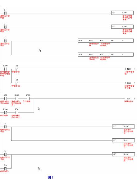 关于色标电机的动作主要和信号盘有信号(有信号时整个环型是不动的),以及当前对标位置是否有管(整个传送带一次移动两个工位每个加工工位是否主要依据两个有管信号检测光电检测并传递,具体处理程序见下图1),再根据色标光电进行自动对标。