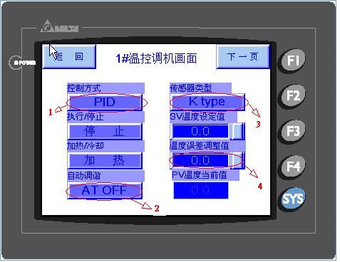 整个系统的整体统配工作有DELTA的DOPA57BSTD的HMI完成。本机尤为特出的是6台温控器的调机工作可以通过HMI的直观、友好、方便、快捷调机画面迅速简单完成极大的方便调机人员,与传统意义上的温控表相比有着相当大的优势。下面为在HMI中组态温控表调机画面: