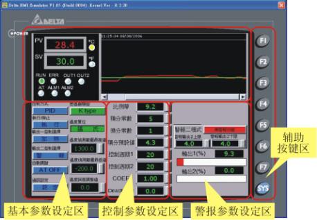 如图十一所示,图十一为主要操作画面,画面主要分为上下两大部分,画面上方为DTC状态显示区,从此部分可实时得到温控器上的数值、灯号及温度曲线图。画面下方则是参数设定区,参数设定分别为基本参数设定、控制参数设定、以及警报参数设定三个区域,可由参数设定区得到DTC所有参数设定值,并 可进行设定,也可利用面版右方的辅助键进行语言之切换(F1-中文、F2-英文)。