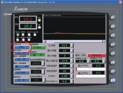 在温控器控制参数设定部分,点选控制方式(Control method),可切换四种不同的控制模式,分别为PID、ON/OFF、手动控制(Manual)、及PID程控(Program)。各种不同的模式设定的人机画面如图十二至十五所示。