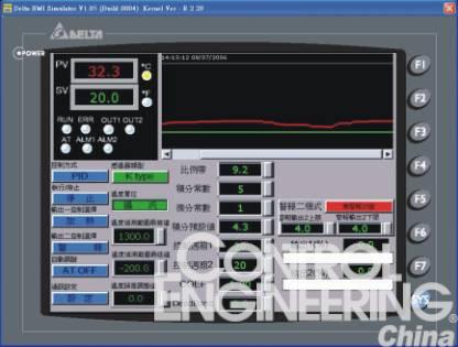 本应用案例是以台达电DOP系列人机(DOP-AE80THTD)整合台达电温控器所规划完成的监控为范例,将原先计算机端提供给温控器作为监控的通讯程序DTCOM,转移至HMI上实现,如图一与图二所示。透过此HMI人机界面可直接更改温控器参数设定,并可同时监控其温度曲线及面版灯号,本范例除了中文操作界面外也提供英文操作界面。