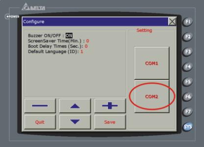 本应用案例是以HMI透过RS-485与DTC温控器通讯,图七为HMI系统设定画面,长按HMI面版右下角SYS按钮即可进入此设定画面,透过此画面可设定时间、背光、定位校准、设定等功能,选择画面中央Settings按键,即可进入设定画面,如图八所示。在图八设定画面中,选择右侧COM2按键即可进入图九通讯设定画面。