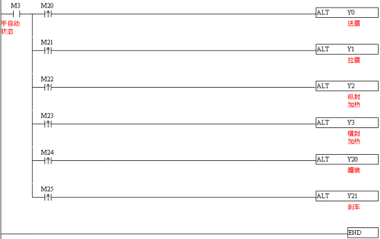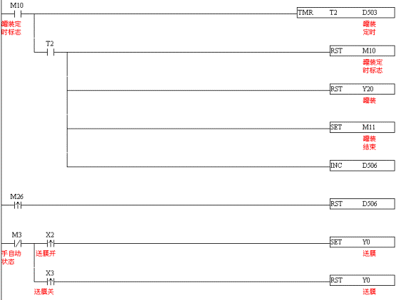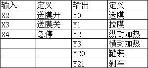 (2)定长控制。长度的控制使用编码器进行回馈控制。编码器联在传动轴上反馈到可编程控制上。200线编码器.装在送膜辊上.送膜辊周长L=Πd,高速計數到200,即送膜長度為L。設定送膜長度为X,則需要高速計數為:X=200×袋长/L