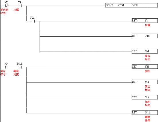 系统相对比较简单,主要难点是定长控制。因为考虑成本问题,选用变频器+编码器结构,所以在变频器停止运行不象伺服系统会瞬间停转,因此当长度高速计数到达后,将离合器动作,使得电机虽然一直在运行,而送膜辊会在离合器动作的瞬间停止运转,这样在很大程度上减小了误差,精度能够满足客户的要求。