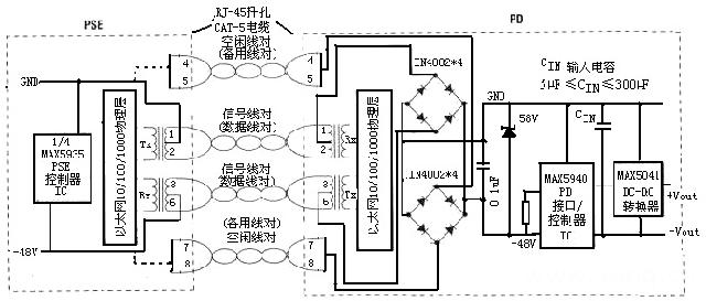 PSE控加制器应用实例见图4所示, 是用MAX5935 PSE控制器和MAX5940 PD接口/控制器的PoE供电糸统简化设计方框图.它给出了千兆位以太网中PSE 和PD的连接。由于千兆位以太网不支持中间电源注入,100/10M以太网模式只能连接到一个端点PSE交换机上,MAX5940 PD接口控制器根据需要也可以加一个或二个。PD还需DC-DC 转换器以输出+Vout -Vout.