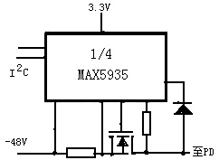 图5为简化的PSE电源控制示意图,控制芯片为MAX5935,其特点为:四个独立-48V PoE端口;可提供的工作模式包括自动、半自动、手动、关断和调试模式。自动模式允许器件在无需软件干预的情况下工作。半自动模式(按需)连续检测并分级连接到端口上的设备,但在接到软件指令前不会给端口加电